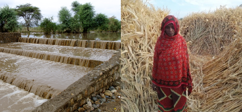 Zum Beispiel gemeinsam mit Gifti Zehara Arba Isse. Die 40-jährige Viehzüchterin ist für eine zwölfköpfige Großfamilie verantwortlich. Das Familienoberhaupt hat zusammen mit den rund 3.000 Einwohnern das ostäthiopische Dorf Teaboy auf eigene Füße gestellt. Die Kommune ist nun weitgehend unabhängig von Sofort- und Lebensmittelhilfe. Eine wichtige Strategie dafür waren Trockensteinmauern und so genannte Flussschwellen, die die Dorfgemeinschaft mit Unterstützung der GIZ und ihrer Partner baute. Diese schützen vor zerstörerischen Fluten aus dem Hochland und leiten das kostbare Wasser in Tiefebenen, wo es im Boden für Anbau und Trockenzeiten gespeichert wird.