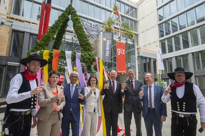 Die Deutsche Gesellschaft für Internationale Zusammenarbeit (GIZ) GmbH hisst den Richtkranz für ihr neues Bürogebäude an der Friedrich-Ebert-Allee 32. Das Unternehmen investiert rund 165 Millionen Euro in den sechsstöckigen Bau, den die Ten Brinke Gruppe umsetzt. Auf einer Fläche von 28.000 Quadratmetern bietet er 850 Arbeitsplätze, die Bonner GIZ- Mitarbeiterinnen und -Mitarbeiter voraussichtlich ab Ende 2019 beziehen werden. Gemeinsam mit dem benachbarten Mäanderbau bildet das Bürogebäude den „GIZ-Campus“, der die Beschäftigten an einem Standort versammeln soll. Derzeit arbeiten rund 1.080 Angestellte in Bonn und Umgebung an mehreren Liegenschaften.