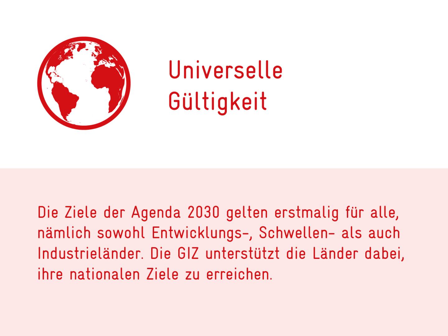Globale Herausforderungen, wie beispielsweise Armut, Hunger und Klimawandel, lassen sich nur gemeinsam lösen. Die Agenda 2030 bildet einen übergeordneten Rahmen, der Ziele und Prinzipien bietet, um diesen Herausforderungen zu begegnen. Und das nicht nur in Entwicklungs- und Schwellenländern. Die Agenda hat eine universelle Gültigkeit: So müssen nun auch Industriestaaten ihren Beitrag leisten. Das ist ein großer Schritt.