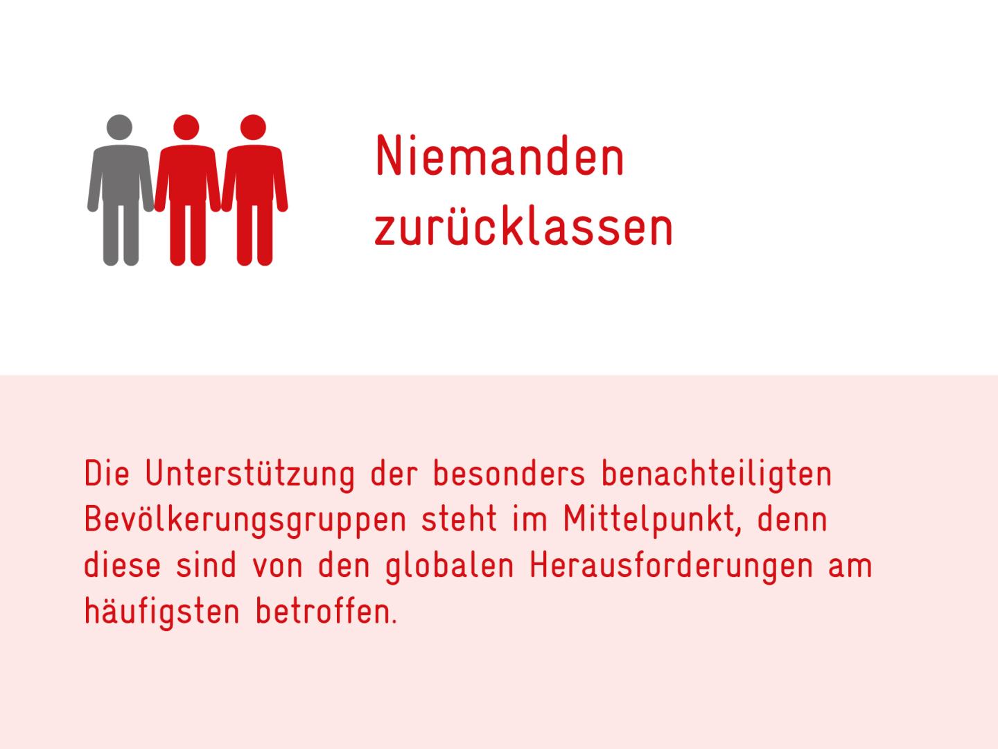 Die oben erwähnte universelle Gültigkeit ist ein wesentlicher Punkt. Ein weiterer Punkt ist, dass die Agenda den Fokus auf die besonders benachteiligten Bevölkerungsgruppen legt. Diese Menschen sind häufig von den globalen Herausforderungen wie Armut und Hunger verstärkt betroffen – wir dürfen niemanden zurücklassen.