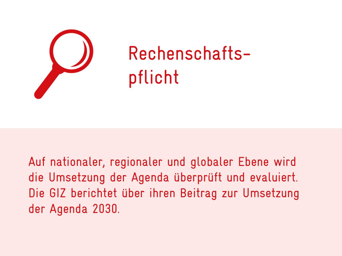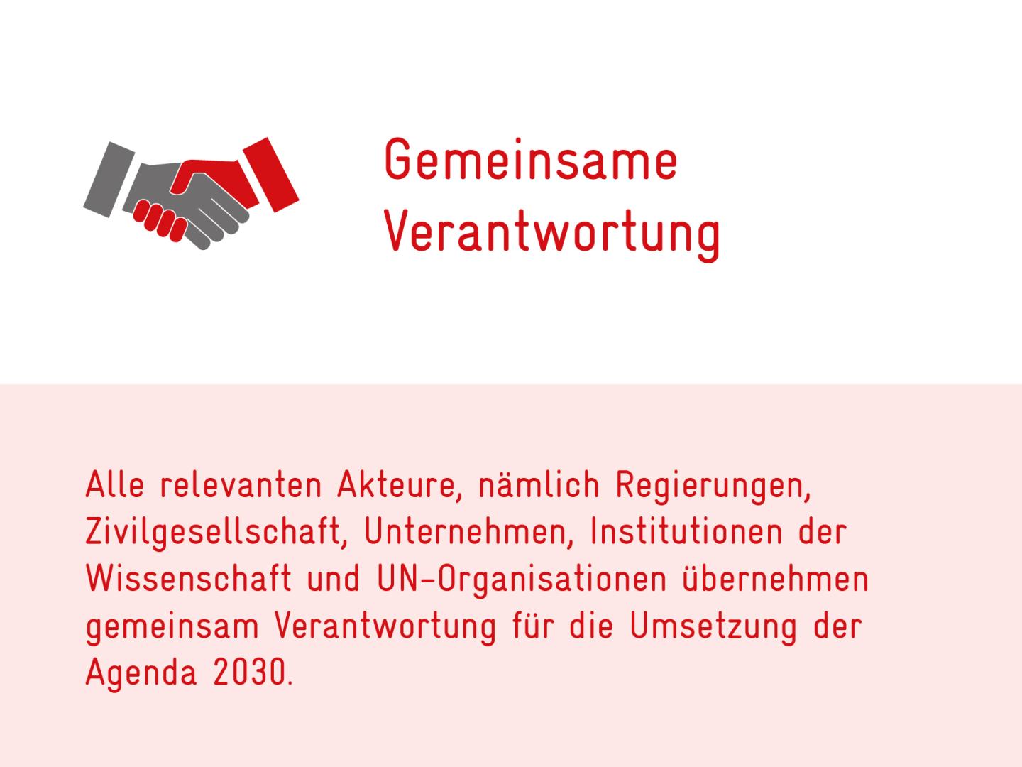 Über all das legen wir Rechenschaft ab: die Umsetzung der Agenda 2030 muss umfassend geprüft und evaluiert werden – auf regionaler, nationaler und globaler Ebene.  Zusammen mit der gemeinsamen Verantwortung und der Integration aller drei Nachhaltigkeitsdimensionen sind dies die fünf Prinzipien, die uns in der Umsetzung leiten.