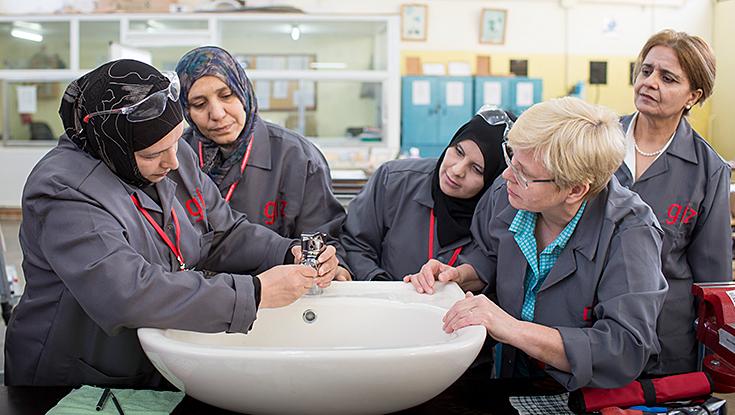 Im Auftrag des Bundesministeriums für wirtschaftliche Zusammenarbeit und Entwicklung unterstützt die Deutsche Gesellschaft für Internationale Zusammenarbeit (GIZ) GmbH die Ausbildung von Klempnern: Knapp 300 Frauen und Männer – mehr als jeder dritte davon ein Flüchtling aus Syrien – werden unterrichtet. „Ich möchte selbstständig arbeiten, unabhängig sein vom Einkommen eines Mannes“, sagt etwa Fatima Ahmad Mubarak. Diesem Ziel sind sie und die anderen Teilnehmer schon ganz nah.
