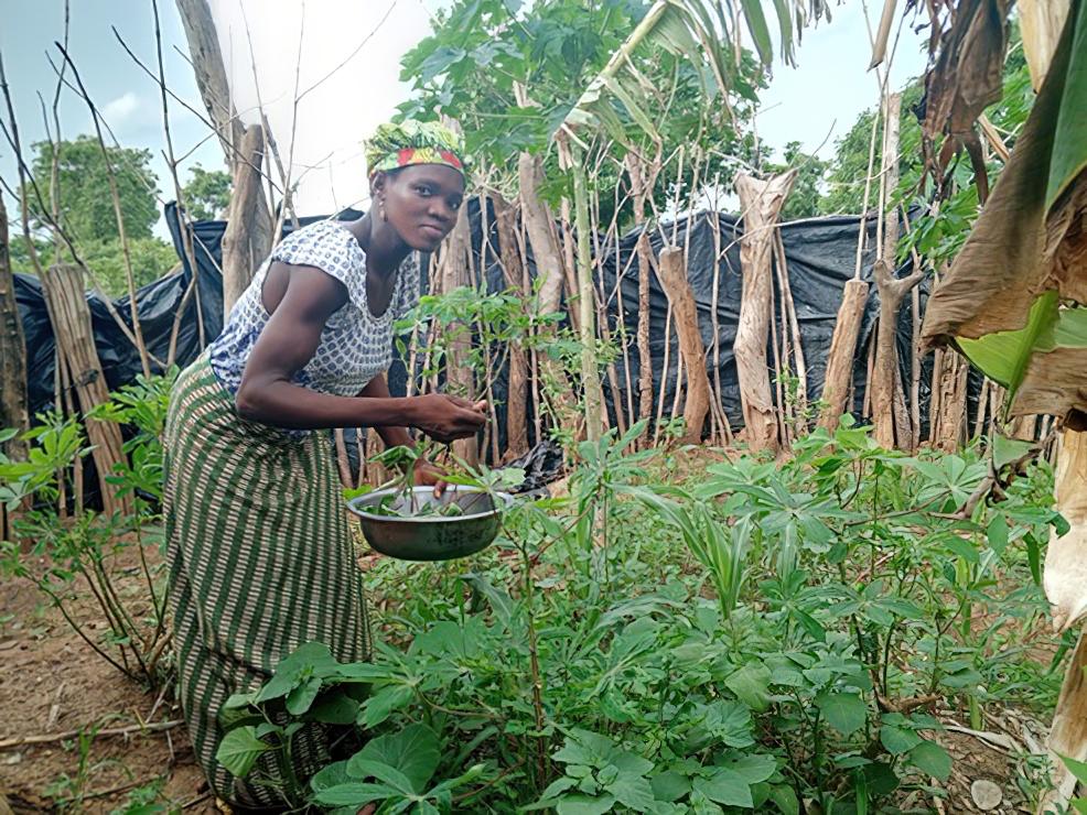 Christine produit plusieurs spéculations dans son jardin tels que les légumes feuilles (amarante, moringa, épinard, patate douce à chair orange, etc.) , le gombo, la tomate, la courge, la papaye et la banane.