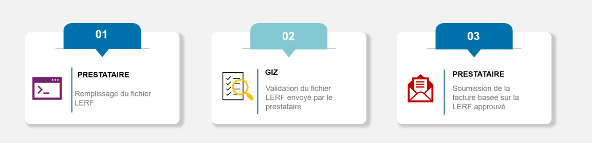 Ce type de facturation est principalement destiné aux prestataires et fournisseurs disposant d’un contrat de prestation ou de financement avec la GIZ. La particularité de ce processus est l’utilisation de notre nouveau formulaire appelé LERF. Il s’agit d’un formulaire au format Excel qui doit être obligatoirement rempli avant la soumission de votre facture. Le processus de facturation se compose de trois parties, comme illustré dans l’image ci-dessous. Nous vous montrons également, dans la vidéo ci-dessous, comment remplir ce formulaire LERF.